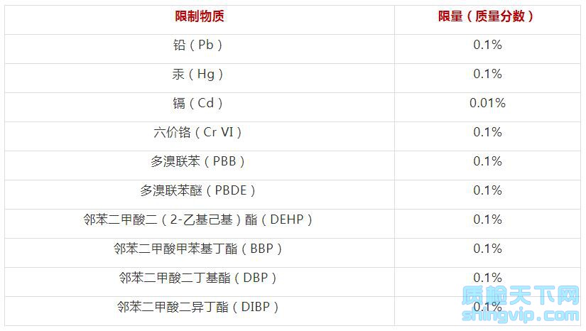 2015年6月4日,歐盟官方公報(bào)(OJ)發(fā)布RoHS2.0修訂指令(EU)2015/863,正式將DEHP、BBP、DBP、DIBP列入附錄II 限制物質(zhì)清單中,至此附錄II共有十項(xiàng)強(qiáng)制管控物質(zhì)。詳見下表: